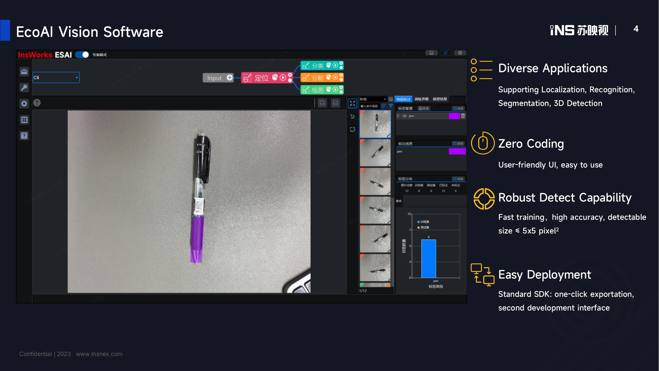 苏映视EcoAI软件拥有用户友好的界面,操作简便,无需编写任何代码。同时,它功能强大,能够胜任多种任务,包括定位、识别、分割和3D检测等。不仅如此,它还以卓越的性能完成任务。EcoAI提供快速训练和高精度结果,甚至可以检测到小于5x5平方像素的尺寸。此外,EcoAI还集成了便捷的部署功能。我们提供标准SDK,支持一键导出和二次开发接口,便于开发者客户使用。